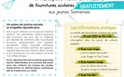 Pour la rentrée scolaire de 2025, tous les jeunes Somainois de nos écoles communales publiques (maternelles et primaires) vont bénéficier d’un trousseau de fournitures scolaires gratuites distribué par les élus de la majorité le vendredi 29 août dans les écoles communales. Ces fournitures gratuites sont complémentaires avec les listes de fournitures données par les […]