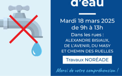 En raison de travaux entrepris par NOREADE, une coupure d’eau est à prévoir le mardi 18 mars de 9h à 13h dans les rues : Alexandre Bisiaux, De l’Avenir, Du Masy, Chemin des Ruelles.