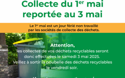 [INFOS DÉCHETS] Pour les habitants concernés par la collecte des déchets recyclables le jeudi : La collecte du jeudi 1er mai est reportée au samedi 3 mai pour raison de jour férié. Veuillez bien à sortir la poubelle des déchets recyclables le vendredi 2 mai au soir.