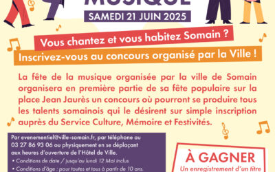 Somain cherche ses nouveaux talents pour la Fête de la Musique le 21 juin 2025 ! Venez jouer en première partie de la Fête de la Musique à Somain place Jean Jaurès, en vous inscrivant par courriel : evenementiel@ville-somain.fr ; ou par téléphone au 03.27.86.93.06. RÈGLEMENT : Les talents participants seront jugés sous forme d’un […]