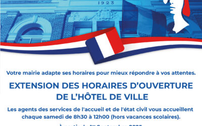 A partir du lundi 6 septembre, votre mairie adapte ses horaires pour mieux répondre à vos attentes. Titre d’identité, état-civil… retrouvez les agents municipaux pour vous aider dans vos démarches chaque samedi (hors vacances scolaires) de 8h30 à 12h00.
