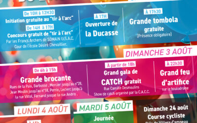 [𝐂𝐨𝐦𝐢𝐭𝐞́ 𝐝𝐞𝐬 𝐟𝐞̂𝐭𝐞𝐬 𝐝𝐞 𝐕𝐢𝐥𝐥𝐞𝐫𝐬-𝐂𝐚𝐦𝐩𝐞𝐚𝐮] Rendez-vous 𝐝𝐮 𝐬𝐚𝐦𝐞𝐝𝐢 𝟐 𝐚𝐨𝐮̂𝐭 𝐚𝐮 𝐦𝐚𝐫𝐝𝐢 𝟓 𝐚𝐨𝐮̂𝐭 pour quatre jours de fête avec au programme : ducasse, initiation au tir à l’arc, gala de catch, brocante, jeux pour les enfants, feu d’artifice et bien plus encore ! Ces festivités sont organisées par le Comité des Fêtes de Villers-Campeau […]