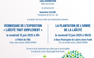 [INVITATION] Monsieur Julien Quennesson, Maire de Somain, en présence de madame Geneviève LECLERC présidente de l’UFAL – Union des FAmilles Laïques 59, vous invitent aux événements suivants : Vernissage de l’exposition “Laïcité tout simplement”, le vendredi 13 juin à 18h00 en hôtel de ville, place Jean Jaurès. Suivi par la “Plantation de l’arbre de la […]
