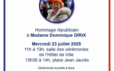 𝗛𝗼𝗺𝗺𝗮𝗴𝗲 𝗿𝗲́𝗽𝘂𝗯𝗹𝗶𝗰𝗮𝗶𝗻 𝗮̀ 𝗠𝗮𝗱𝗮𝗺𝗲 𝗗𝗼𝗺𝗶𝗻𝗶𝗾𝘂𝗲 𝗗𝗜𝗥𝗜𝗫 En hommage à madame Dominique DIRIX, 1ère adjointe au Maire, une cérémonie de recueillement aura lieu ce mercredi 23 juillet 2025, de 11h à 13h en salle des cérémonies de l’Hôtel de Ville, et de 13h30 à 14h00 sur la place Jean Jaurès Cérémonie ouverte à tous.